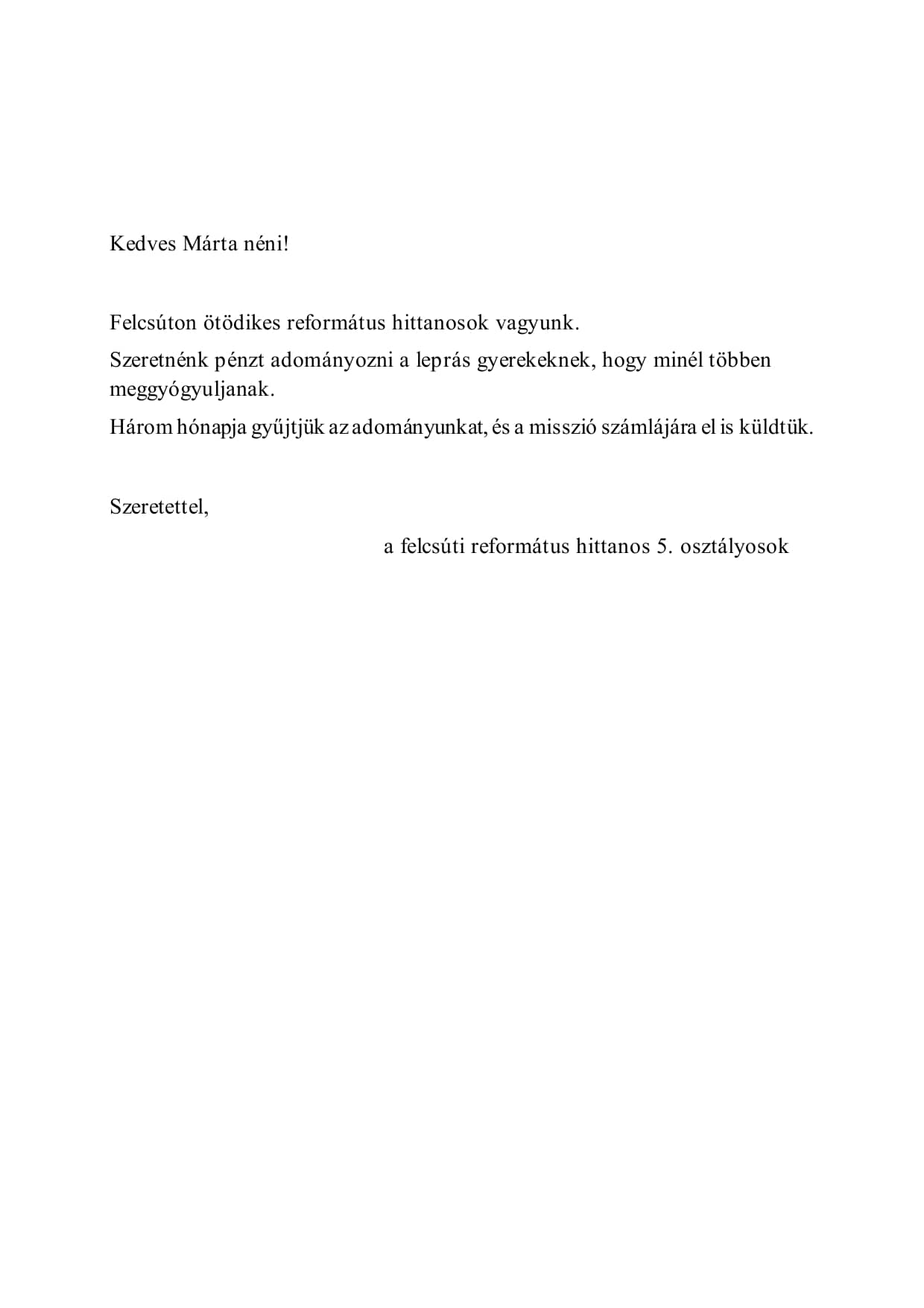 Szívmelengető levelet kaptunk a felcsúti 5. osztályos református hittanosok csoportjától! Hitoktatójuk a Lepramisszió munkájáról tanította őket, ami olyan mélyen megérintette a 17 gyermeket, hogy nagy elhatározásra jutottak: kis zsebpénzükből adományt gyűjtöttek a gyógyításra! Felajánlásukat a mellékelt levéllel küldték el. Hálásan köszönjük az érzékenyítő tanítást Hős Orsolya lelkipásztornak, a gyermekeknek pedig a jószívű adományt! Reméljük, hogy a jó példa követőkre talál, és minél több olyan gyermekből lesz felnőtt, akikben az ismeretek mellett az együttérző szeretet is növekszik! (a képen a csoport egy része)